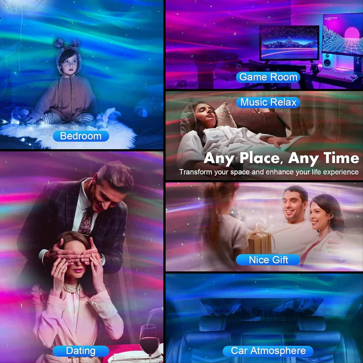 Many users place the projector in their bedroom to create a relaxing nighttime environment. The soft aurora lighting helps create a peaceful atmosphere before sleep.